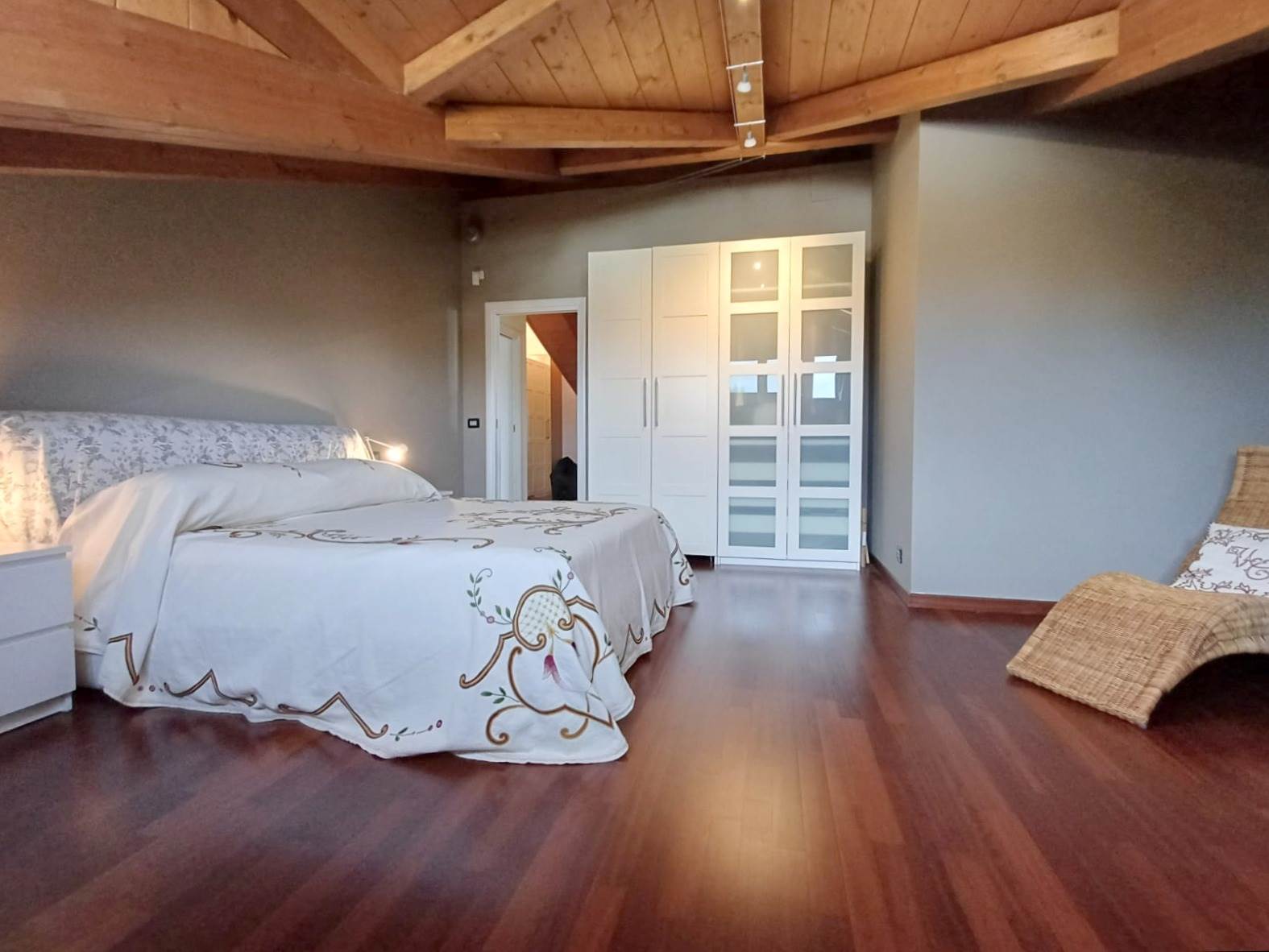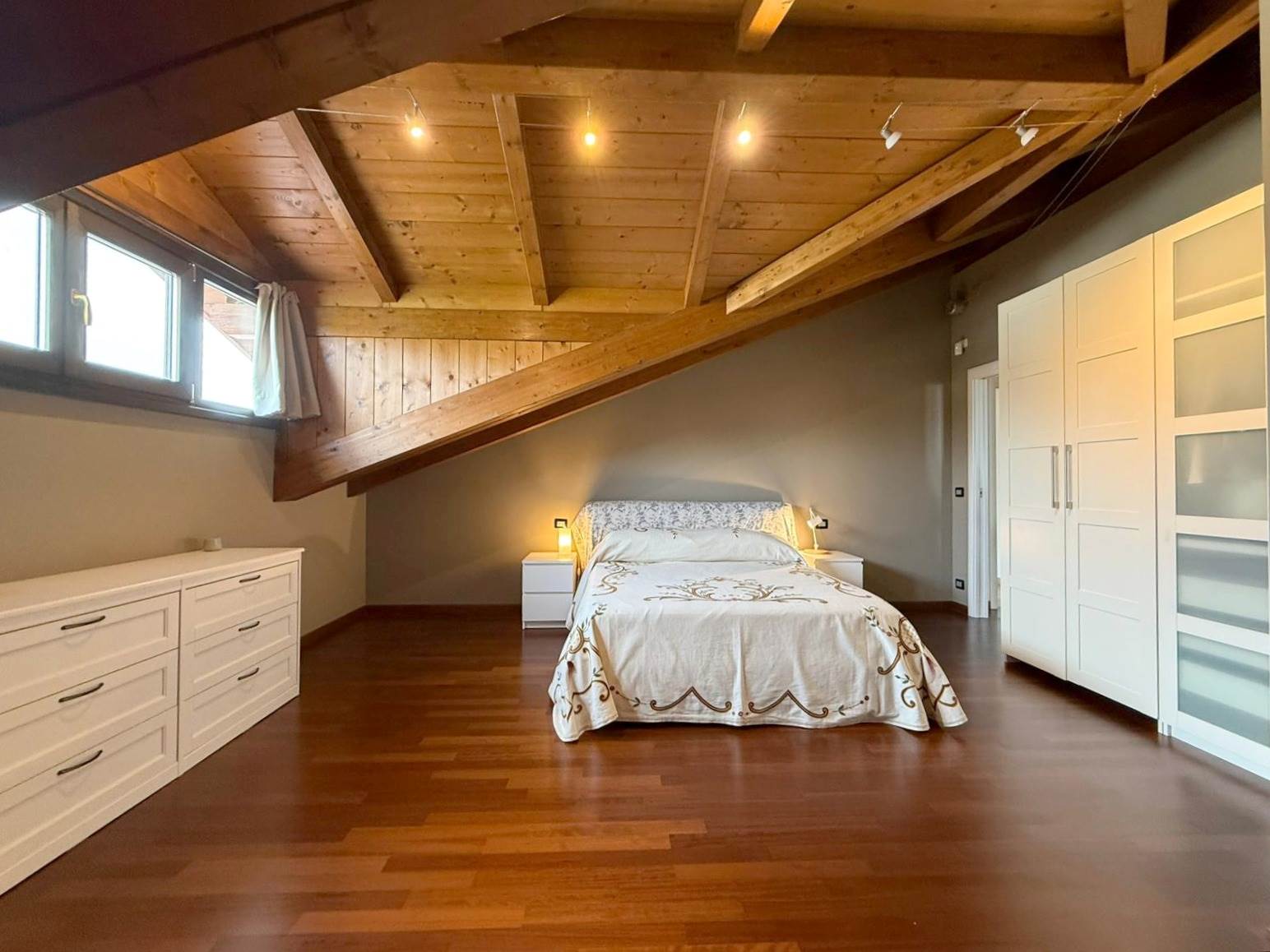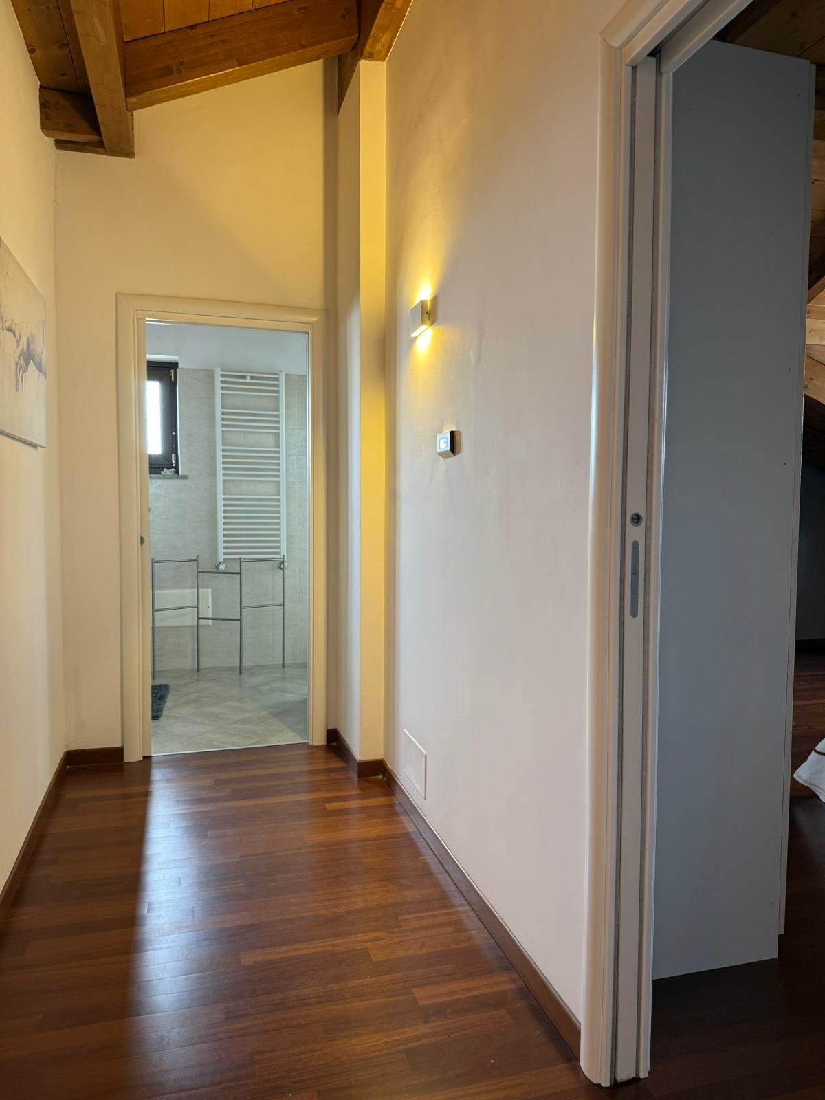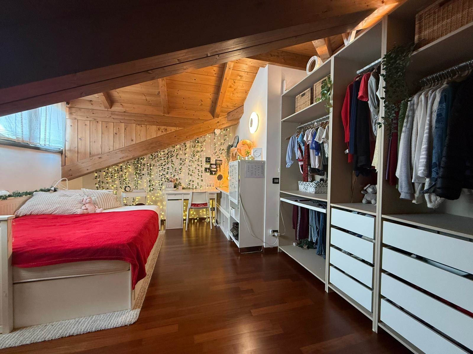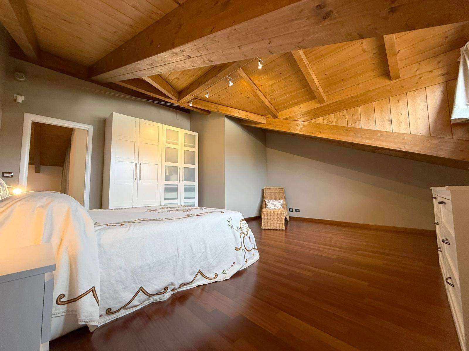 Salendo al primo piano, tramite una comoda scala interna, si accede alla zona notte, caratterizzata da soffitti mansardati alti con travi in legno a vista. Si compone di ampio open space, camera matrimoniale con finestra vista montagne e cameretta con terrazzino. Un secondo bagno con una doccia doppia completa il piano. Dal disimpegno è possibile accedere al locale sottotetto, utilizzabile come ripostiglio o spazio aggiuntivo in base alle proprie esigenze.