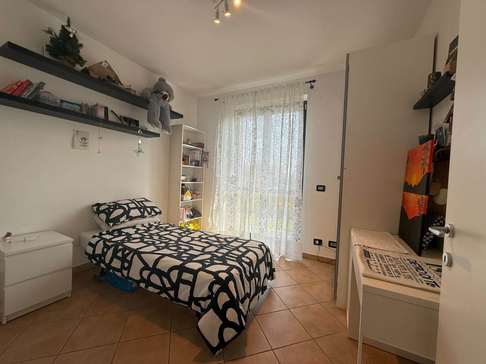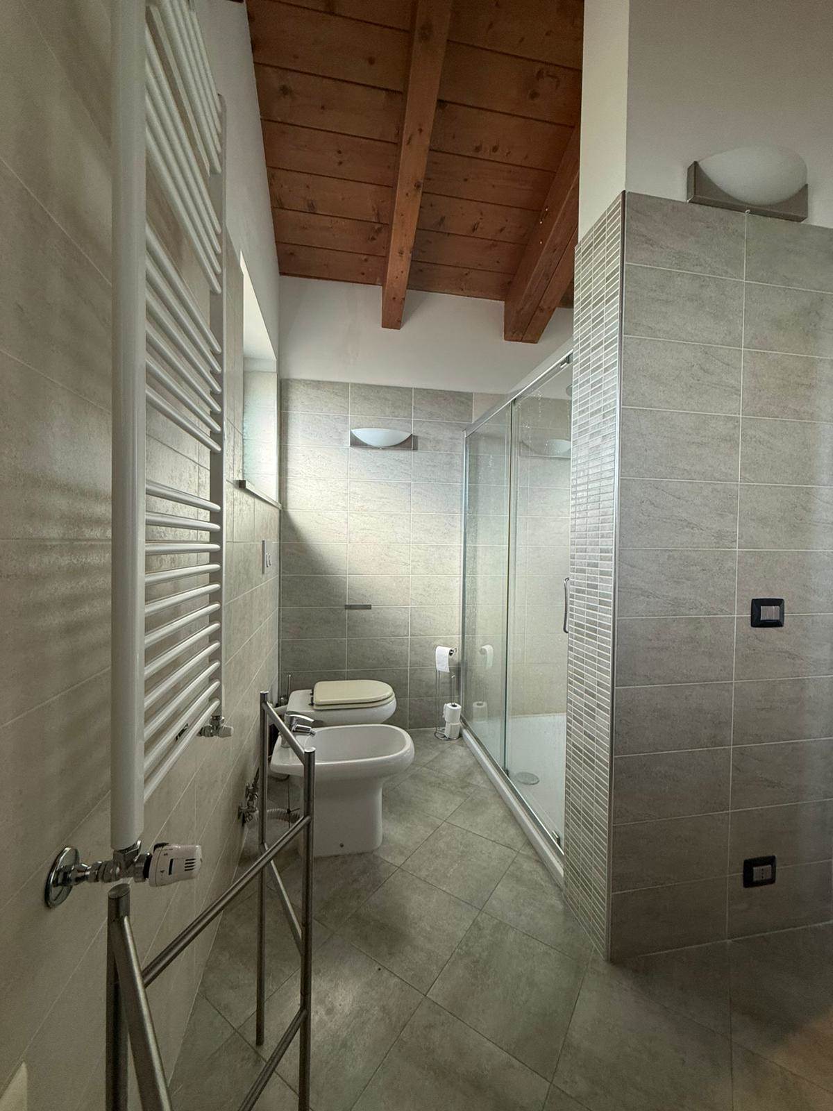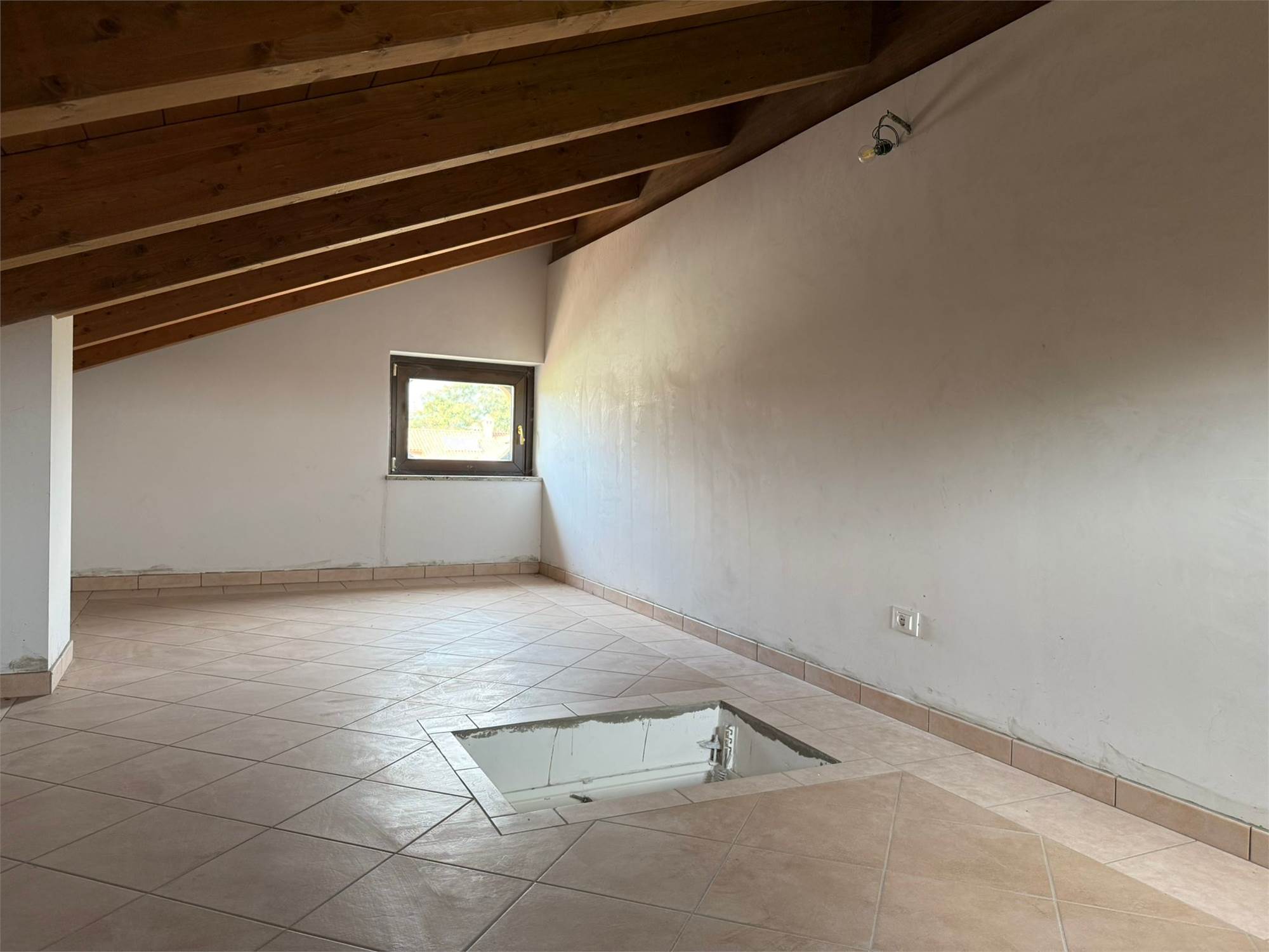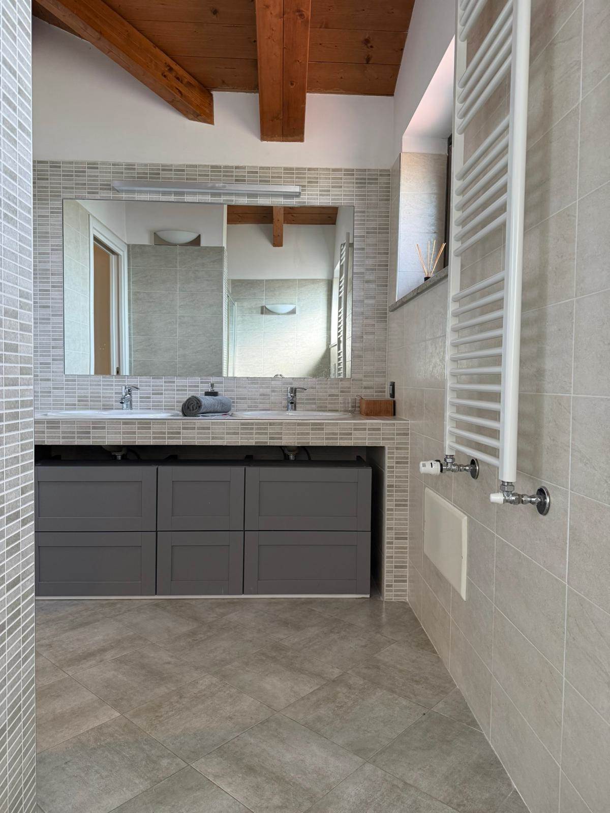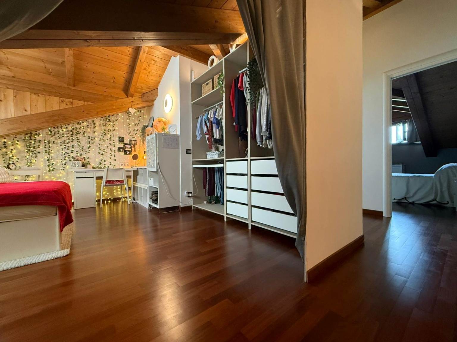 Salendo al primo piano, tramite una comoda scala interna, si accede alla zona notte, caratterizzata da soffitti mansardati alti con travi in legno a vista. Si compone di ampio open space, camera matrimoniale con finestra vista montagne e cameretta con terrazzino. Un secondo bagno con una doccia doppia completa il piano. Dal disimpegno è possibile accedere al locale sottotetto, utilizzabile come ripostiglio o spazio aggiuntivo in base alle proprie esigenze.